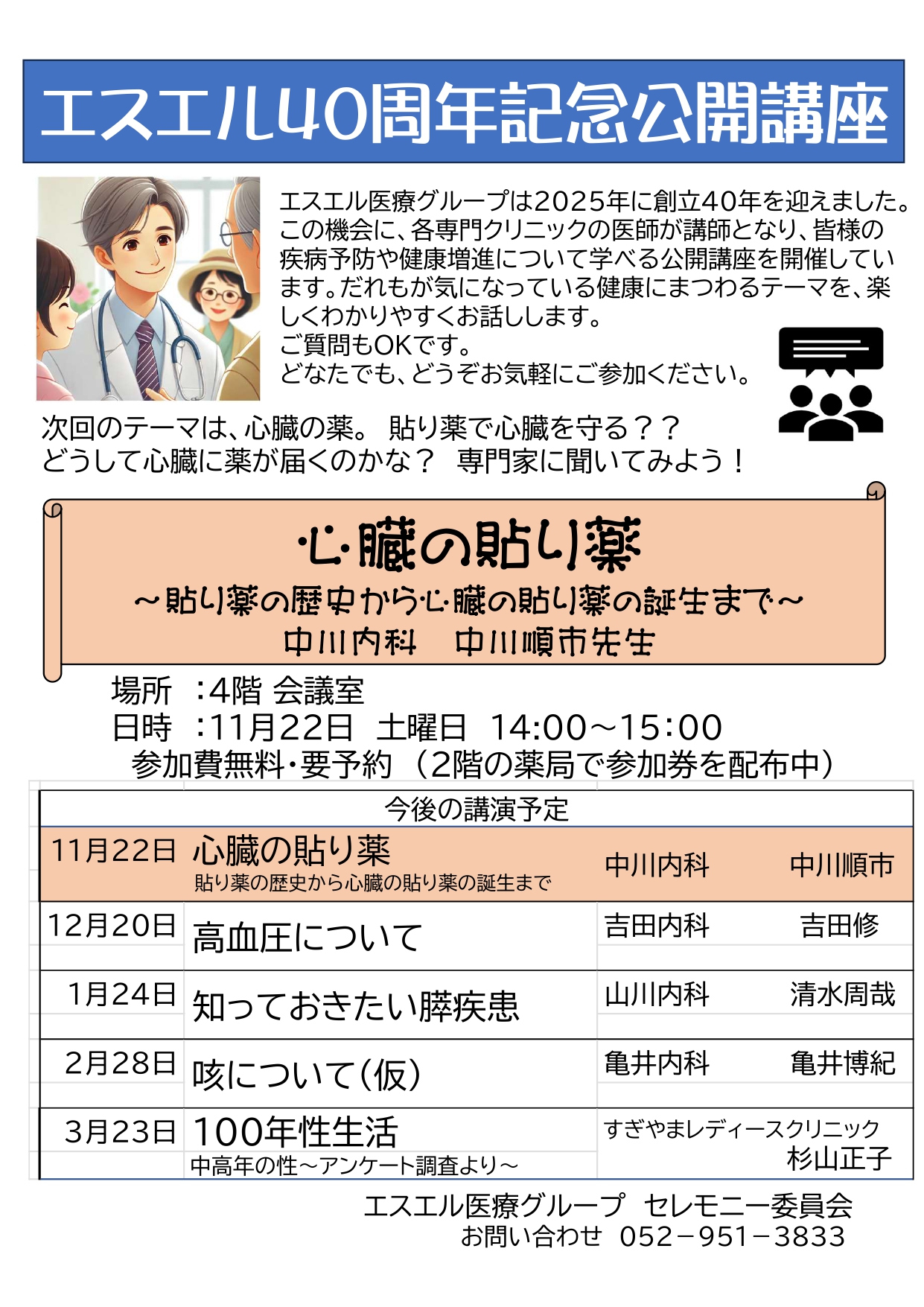 エスエル40周年記念・公開講座(無料)のお知らせ:11月22日(土)14:00「心臓の貼り薬~貼り薬の歴史から心臓の貼り薬の誕生まで~」