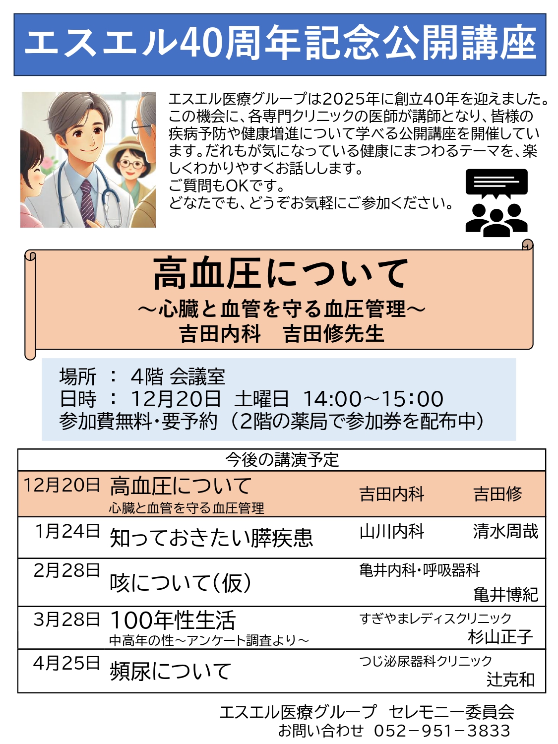 エスエル40周年記念・公開講座(無料)のお知らせ:12月20日(土)14:00「高血圧について~心臓と血管を守る血圧管理~」