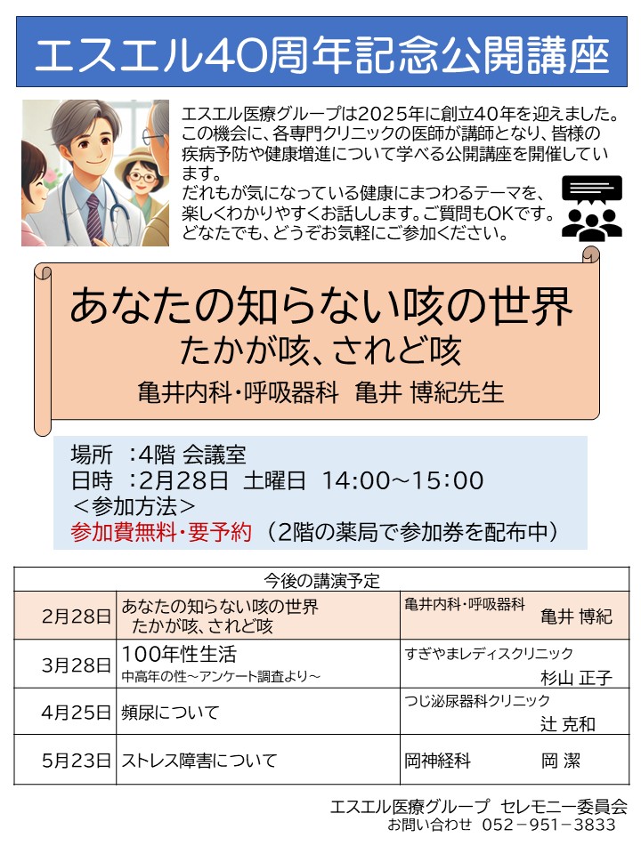 エスエル40周年記念・公開講座(無料)のお知らせ:2月28日(土)14:00「あなたの知らない咳の世界 たかが咳、されど咳」