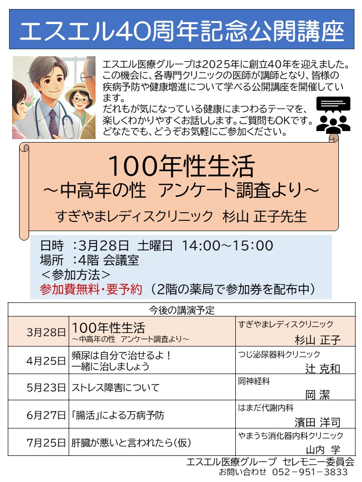 エスエル40周年記念・公開講座(無料)のお知らせ:3/28(土)「100年性生活~中高年の性・アンケート調査より~」、4/25(土)「頻尿は自分で治せるよ! 一緒に治しましょう」