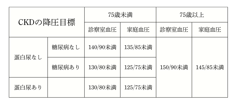 年齢、蛋白尿の有無、糖尿病の有無により目標血圧が異なります。