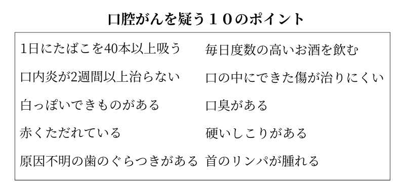 舌や歯肉の盛り上がり、硬いしこり、なかなか治らない口内炎などの症状には注意が必要です。